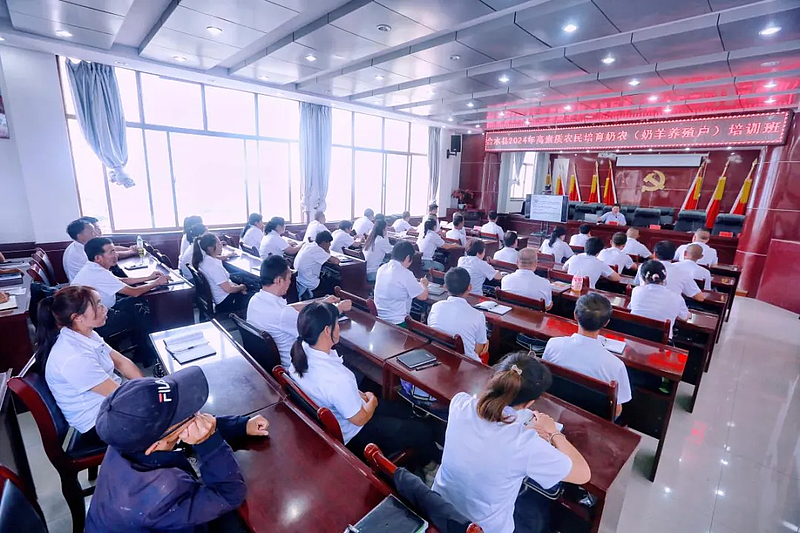 7月15日,在甘肃省合水县肖咀镇政府培训室,来自西北农林科技大学付明哲教授正在为奶羊养殖户讲解奶羊疾病防疫相关知识。现场50余名养殖户借此机会解答自己养殖奶羊过程中的困惑,不断和专家交流 “取经”。