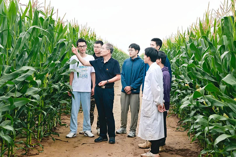 薛吉全教授(左三)在旬邑玉米试验示范基地,同学生一起查看密植高产高效栽培技术下的玉米长势情况。