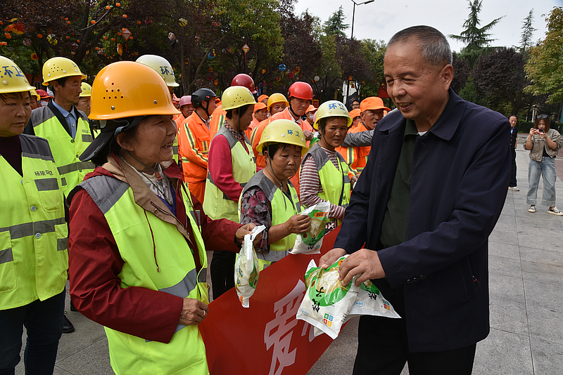 10月9日,在重阳佳节来临之际,杨凌示范区慈善协会联合示范区老年书画学会以及爱心人士,在杨陵区文化馆广场开展杨凌示范区2024年九九重阳节慰问环卫工和困难老人款物发放仪式,营造养老孝老敬老社会氛围。