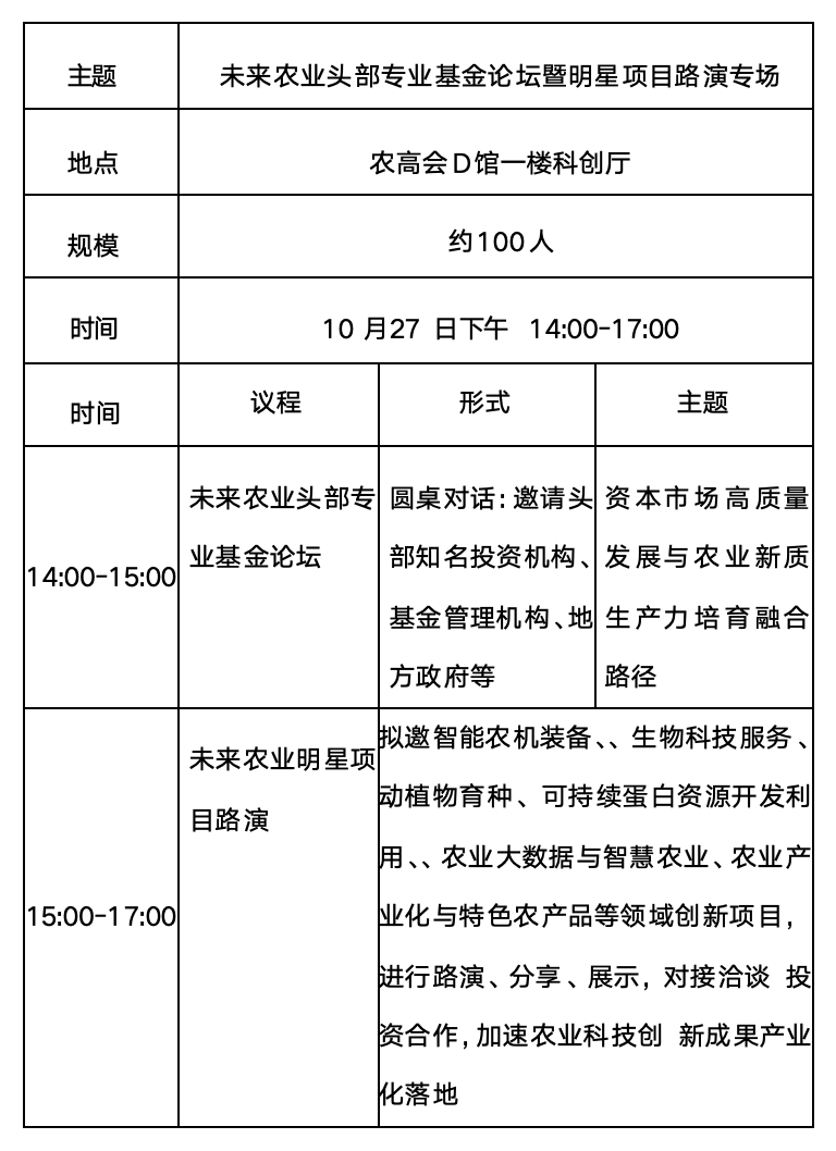 2024大会初心不变,同时将紧扣农高会“注重实效”新要求,“更聚焦、更直接”的围绕“技术、人才、资金、市场”四大方向,组织“尖峰论坛+主题发布+专场沙龙+项目路演”,助力产业发展。