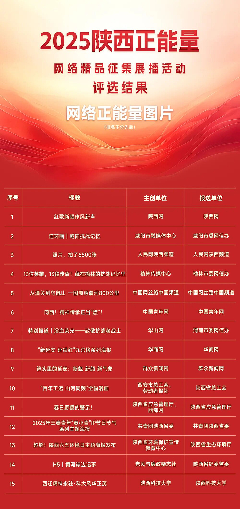 日前,陕西省委网信办发布2025陕西正能量网络精品征集展播活动评选结果,经作品征集、评审、公示等环节,评选出了100件网民认可、社会认同、影响广泛的网络精品。其中,杨凌示范区共有3件作品入选分别是西北农林科技大学主创的我欠先生一个拥抱、杨凌农科传媒集团主创的我在中国学农技、2025“我在杨凌看上合”。网络主题宣传活动完整名单如下: