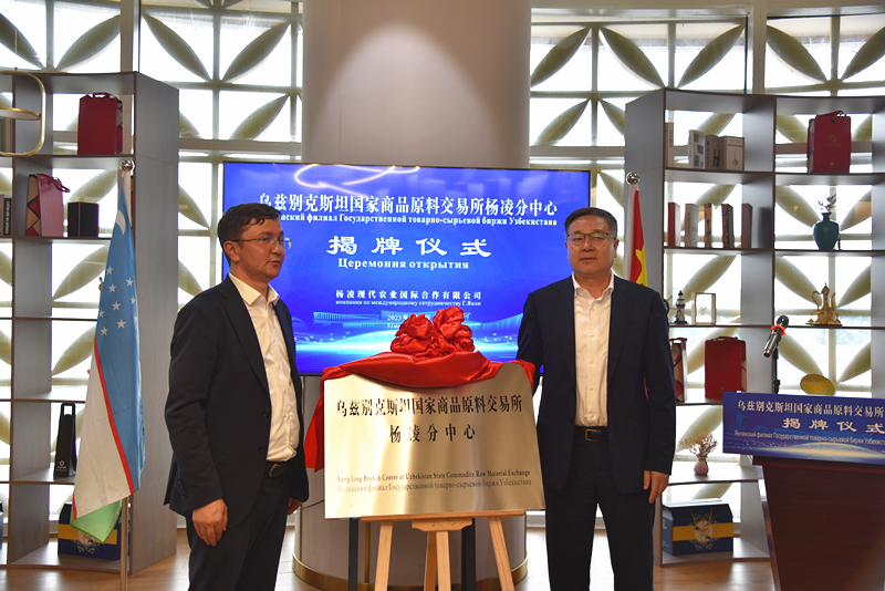 在2023上海合作组织减贫和可持续发展论坛成功举办及上合组织农业技术交流培训示范基地设立4周年之际,5月31日,乌兹别克斯坦国家商品原料交易所入驻上合组织农业基地经贸投资促进中心揭牌仪式在杨凌举行。杨凌示范区党工委委员、管委会副主任刘仲山,乌兹别克斯坦国家商品原料交易所管理委员会主席巴德里迪诺夫共同揭牌。