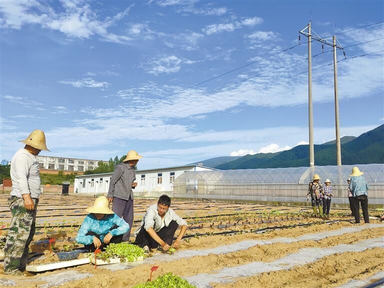 陕西太白冷凉蔬菜科技小院首席科学家、西北农林科技大学研究员惠麦侠(左二)带着研究生杨岩松(左四)与农户一起进行生菜定植。