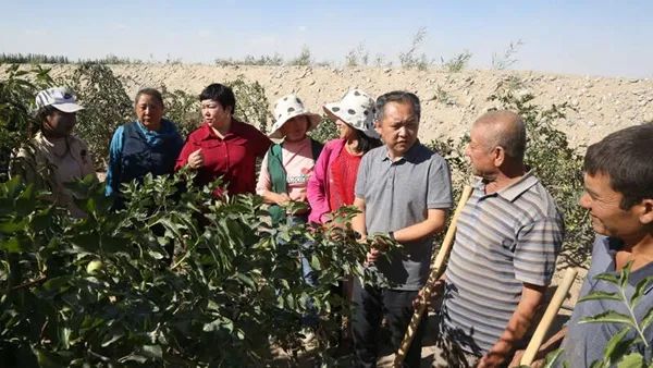 韩刚(右三)和哈丽娜(左三)指导策勒县群众科学管理红枣