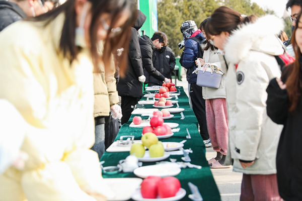 12月17日,西北农林科技大学在西雕学生社区举办了第七届苹果文化节,现场展示了秦脆、秦蜜、秦帅、瑞阳、瑞雪、瑞香红等100多种琳琅满目的优质苹果品种资源,还有校友企业赞助的优质苹果约2500公斤,吸引着全校近万名学生兴致勃勃地参观、品鉴和领取。大家纷纷拍照,分享这一甜蜜和幸福的时刻。