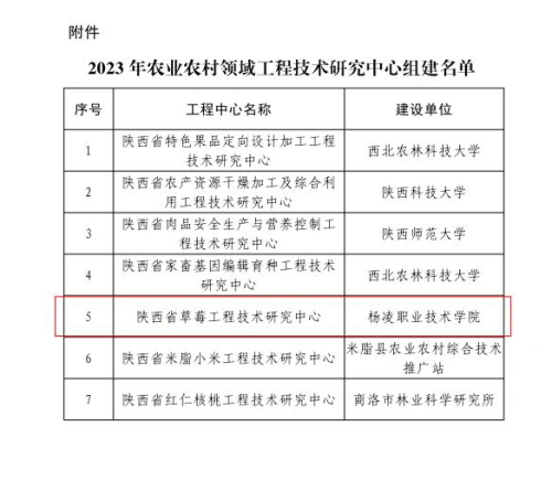 12月20日,陕西省科学技术厅公布了农业农村领域工程技术研究中心组建名单,杨凌职业技术学院获批建设“陕西省草莓工程技术研究中心”。是继2022年获批“陕西省动物疫病防控工程技术研究中心”后,又一省级工程中心获批。