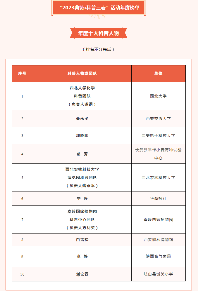 2023年12月28日,“2023典赞·科普三秦”活动发布盛典在陕西广播电视台举办,现场揭晓了陕西省2023年度十大科普人物、年度十大科普作品、年度优秀科普场馆和年度品牌科普活动。杨凌示范区科学技术协会推荐的西北农林科技大学博览园科普团队入选“年度十大科普人物”。