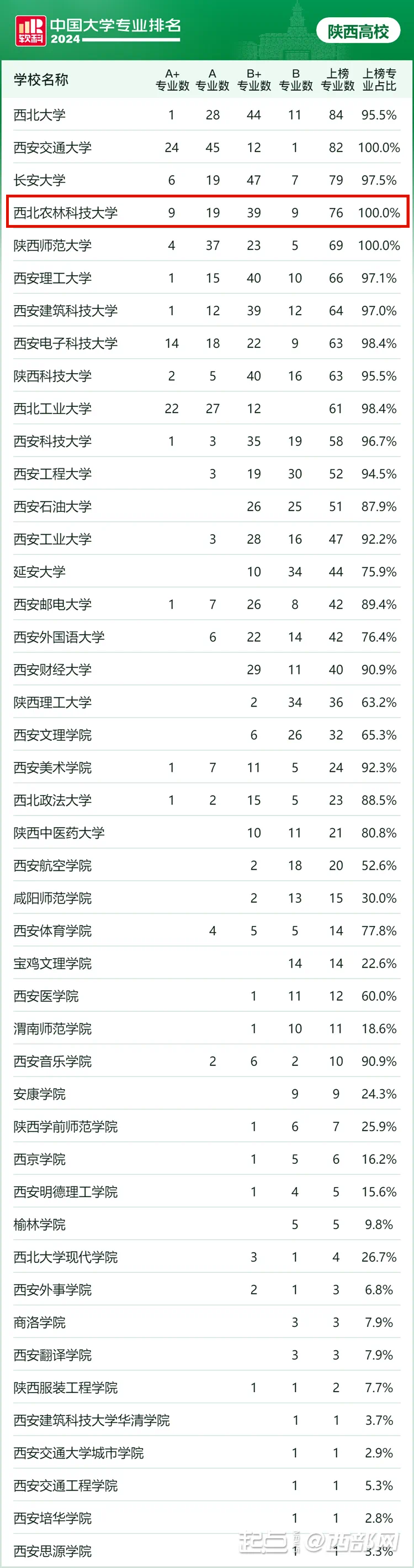 日前,高等教育专业评价机构软科发布了“2024软科中国大学专业排名”。在今年的软科中国大学专业排名中,陕西共有45所高校的1367个专业上榜,上榜专业总数位居全国第九。其中,A+专业数88个,A专业数262个,B+专业数583个,B专业数434个。陕西顶尖专业(A+)数量居全国第五,其中西北农林科技大学上榜专业占比高达100%。
