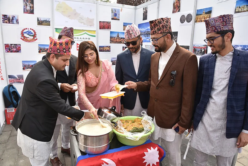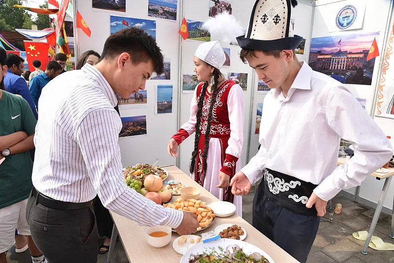 随着舞台上的表演逐渐进入高潮,广场四周搭建起的展位也迎来了更多人的目光。只见25个国家的留学生们热情邀请大家品尝亲手制作的特色美食,并认真展示、介绍当地民族工艺品、文化服饰,不同国家、不同民族、不同文化、不同肤色的各国学生此刻跨越山海,心意紧紧相通。