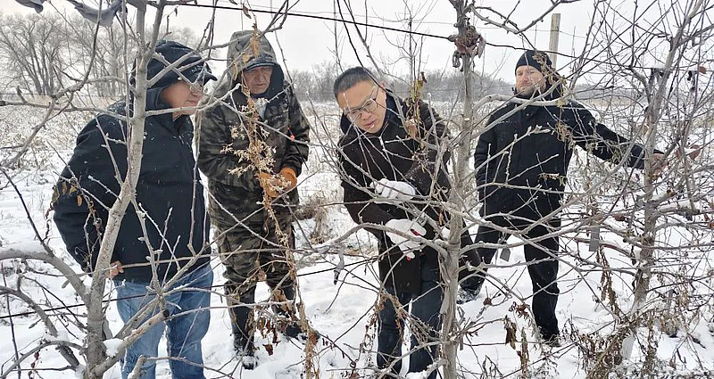 2024年12月8日,西北农林科技大学教授张东(右二)在吉尔吉斯斯坦楚河州的中吉果木良种繁育示范园进行冬季苹果苗木修剪技术培训。
