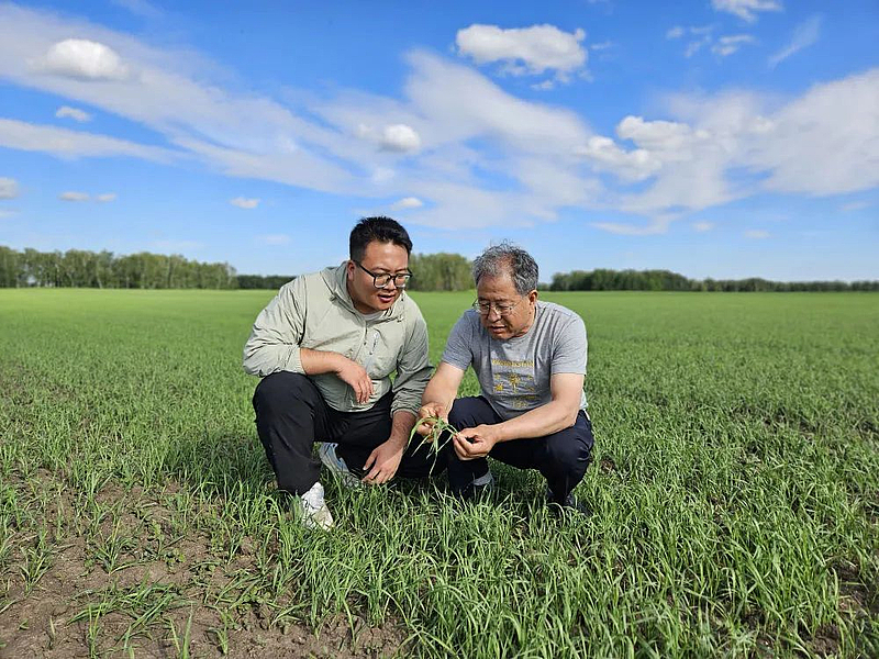 2024年6月19日,西北农林科技大学教授张正茂(右)与学生在哈萨克斯坦北哈州的农业示范园调查小麦生长情况。