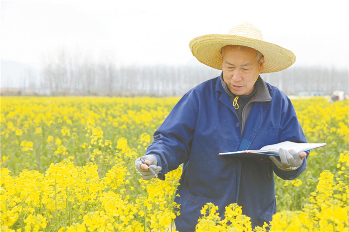 董育红在种植基地观察、记录油菜生长情况。(资料图)