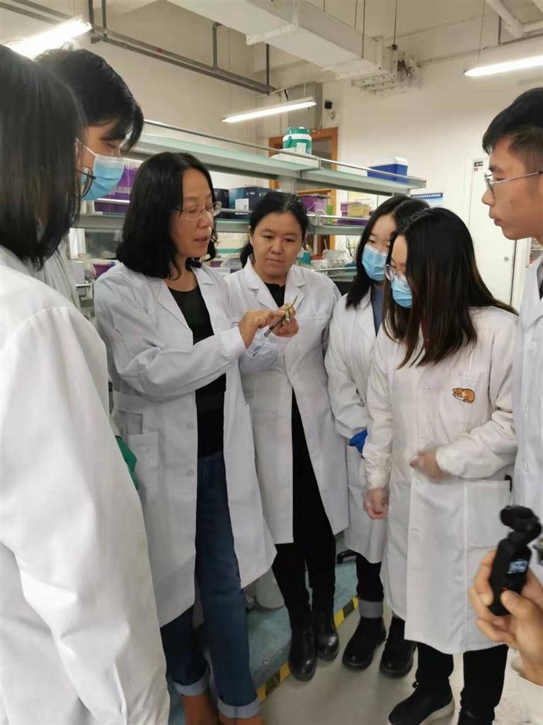 黄丽丽(左三)在实验室给学生讲解病虫害防治知识。