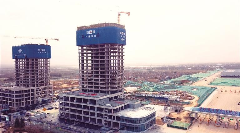 综合服务区内,海关大楼和保税研发楼两栋已经封顶的“L”形大楼相对而立,两栋大楼中间的地下车库地面部分堆放着很多防水卷材。工人们正在进行大楼外立面整饰施工和地下车库回填土、车库顶板防水施工作业。