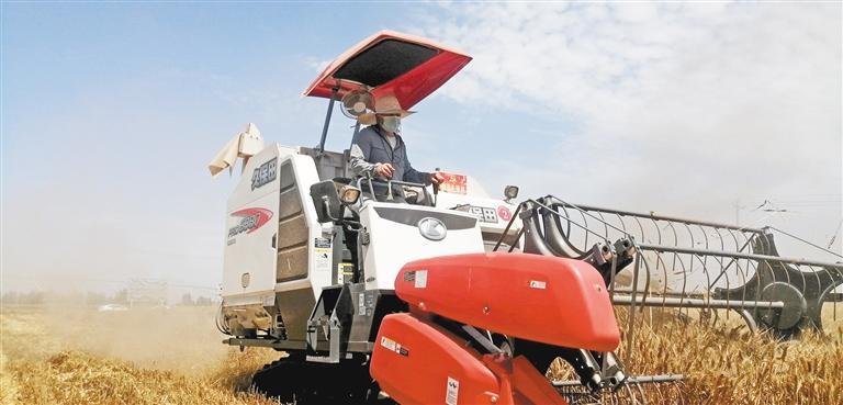 在曹新庄试验农场上合小麦育种创新基地,农机手正在抢收小麦育种材料。 仵永杰摄