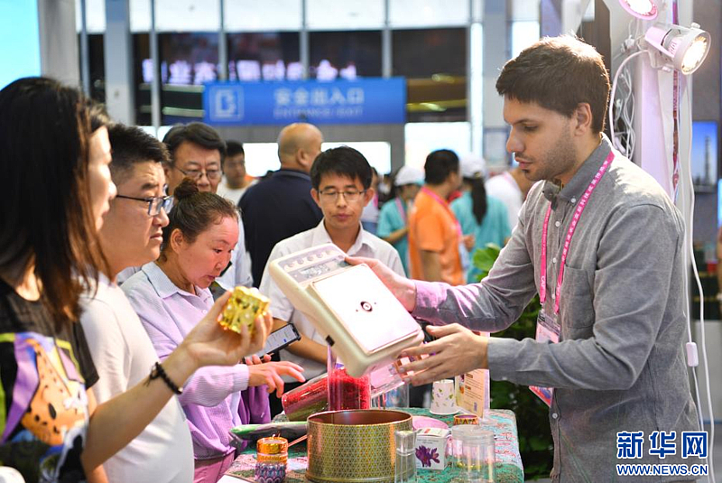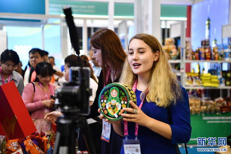 来自俄罗斯的参展商在杨凌农高会展台进行直播