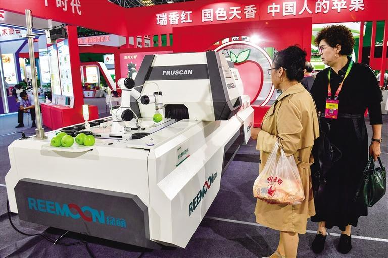 9月21日,在第30届杨凌农高会B馆苹果展台,绿萌科技苹果智能分选设备吸引参观者驻足观看。 本报记者 袁景智摄