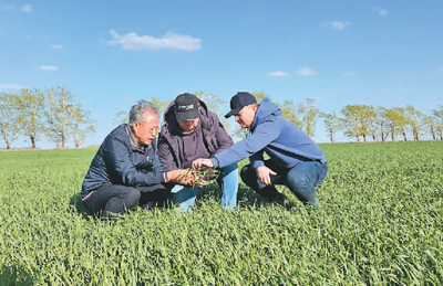 西北农林科技大学教授张正茂(左一)与哈萨克斯坦专家观察农作物生长情况。受访者供图