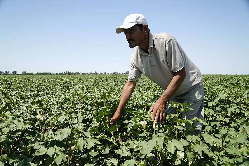 7月28日,在乌兹别克斯坦锡尔河州的上合组织农业基地中乌现代农业科技示范园,棉农乌兹别科夫检查棉花种植情况。新华社发(扎法尔摄)