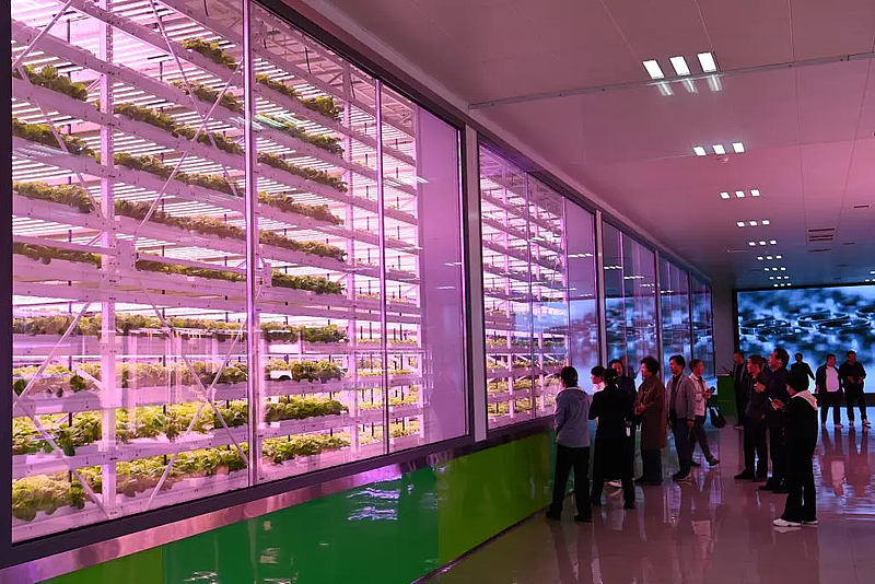 走进田间展区的植物工厂,绿油油的生菜被栽种在无土栽培床内,如货架一般一层层叠放直逼天花板。在这里,从播种到催芽、分栽、收获,蔬菜生长全程自动化,且环境和营养精准可控。以生菜为例,只需42天便可收获,比传统大田种植缩短一半时间,还节能环保、避免了对土壤的破坏。