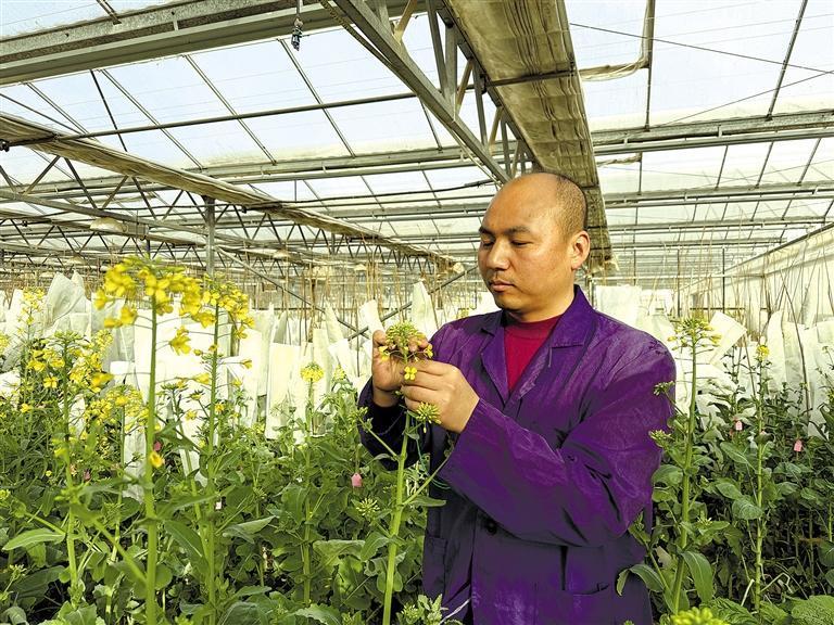 关周博是陕西省杂交油菜研究中心育种研究室主任。最近是油菜花杂交授粉的关键时期。他和同事几乎每天都要来加代温室,仔细观察记录。