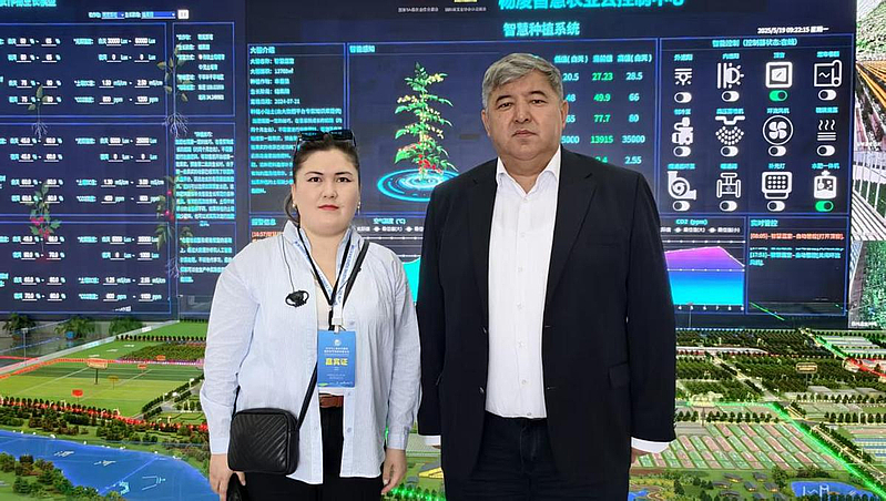 在旱区农业节水技术与装备田间展现场,西北农林科技大学朱德兰教授团队展示了在乌兹别克斯坦的合作成果。2021年,团队将我国先进的太阳能驱动节水灌溉技术和智能型水肥一体技术引入乌兹别克斯坦,建成面积近100亩的中乌节水农业海外示范园,形成适合当地的节水灌溉系统。这几年,团队在乌兹别克斯坦开展国家重大研发项目,先后与塔什干国立农业大学、塔什干水利与农业机械工程大学合作建成中乌智慧灌溉联合实验室;在哈萨克斯坦,通过盐碱地治理示范园研究节水控盐灌溉技术,探索旱区盐碱地治理方法。