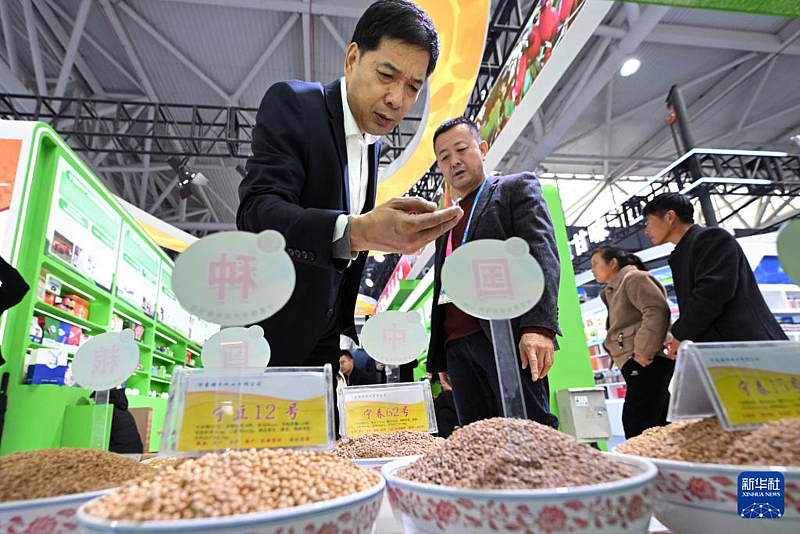 10月25日,参观者在杨凌农高会宁夏展位上了解作物种子。新华社记者 李一博 摄