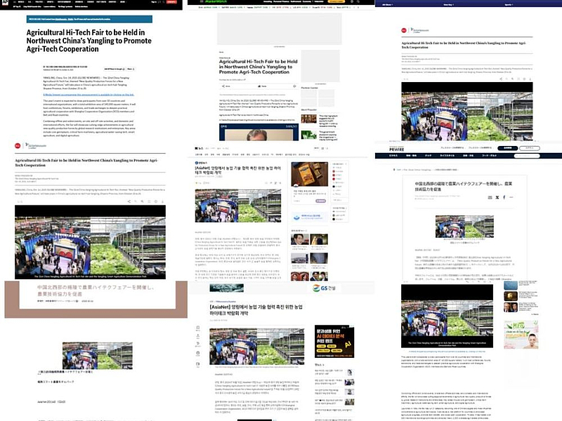 日前,全球通讯社联盟刊发文章《Agricultural Hi-Tech Fair to be Held in Northwest China's Yangling to Promote Agri-Tech Cooperation》(中译名:让农业科技全球共享 第三十二届中国杨凌农业高新科技成果博览会将于10月25日开幕),提前关注本届农高会的新亮点,文章在以英、日、韩、泰语四种语言在美国、英国、德国、加拿大、日本、韩国、泰国等欧美、亚太和非洲地区共45个国家的重点媒体发布。