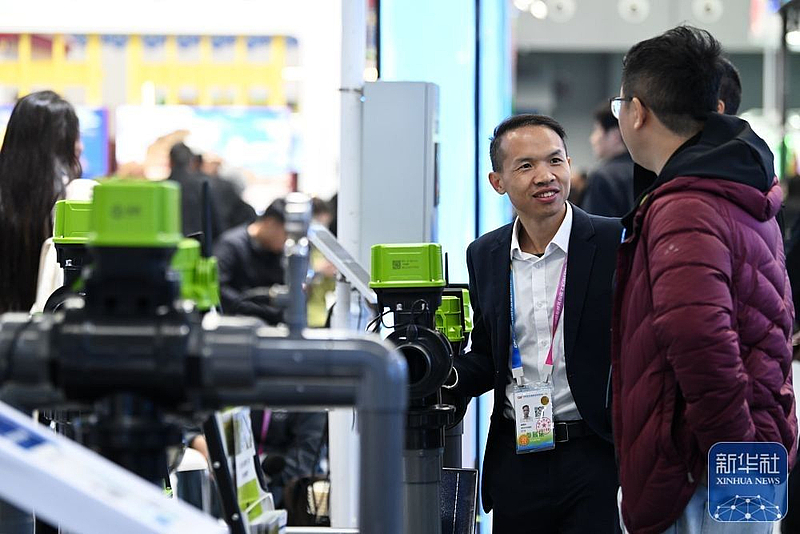 参展商在杨凌农高会上向参观者介绍智能灌溉系统。新华社记者 李一博 摄