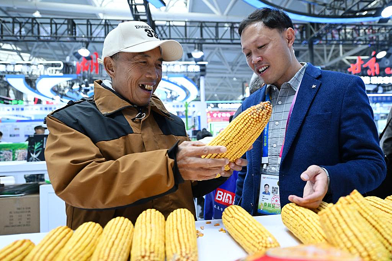 10月25日,参观者在杨凌农高会深圳展区了解玉米品种。新华社记者 李一博 摄