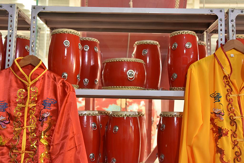 产业园内陈列的鼓和演出服装。新华社记者 郑昕 摄