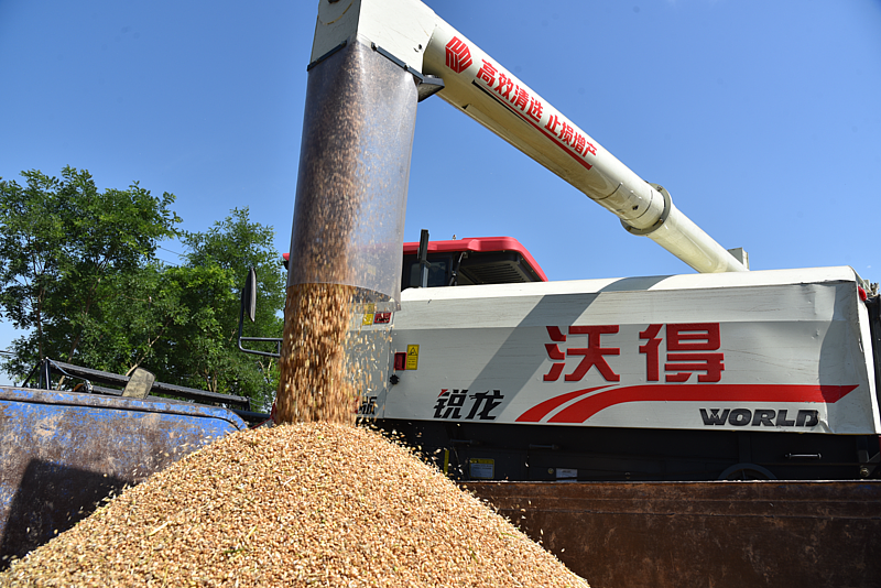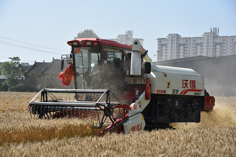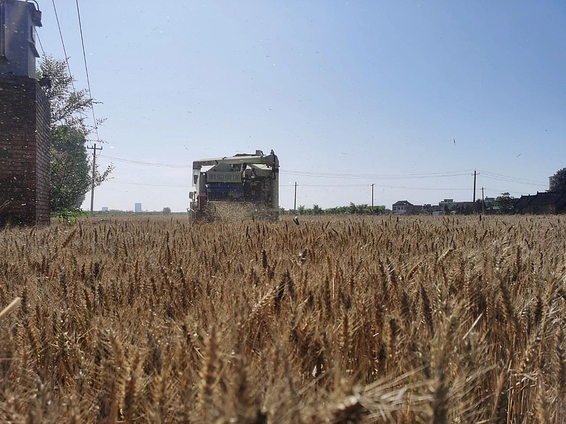 芒种时节,杨陵区揉谷镇小麦田中农机声轰鸣,伴随着联合收割机的来回穿梭,成片的麦子被快速收割、脱粒,一场与时间赛跑的麦田抢收战正在进行。