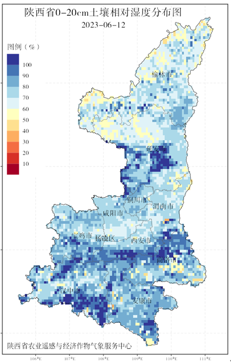 根据地面、雷达、卫星等多源数据的陆面同化系统(CLDAS)土壤相对湿度产品显示:6月12日08时杨凌0-20厘米土壤湿度60%-70%,适宜夏种作业开展。
