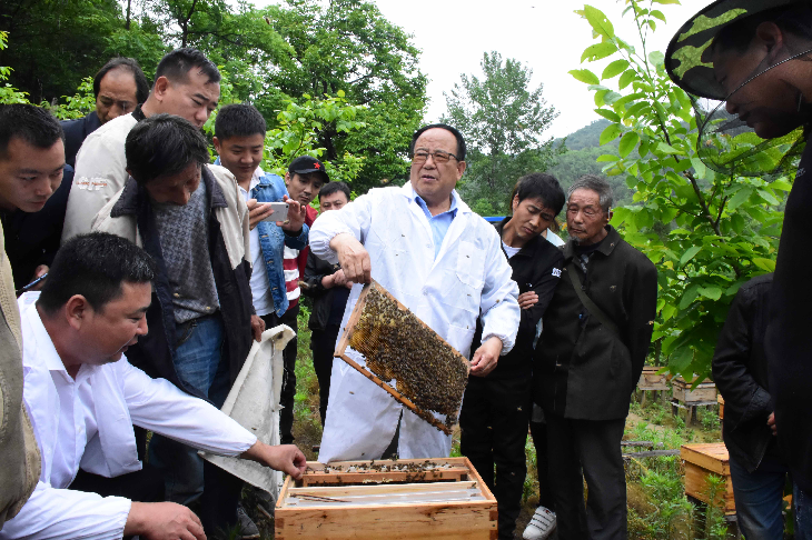 受益的不止陇县丰田蜂业合作社。王军成是宁夏固原市原州区彭堡镇阎堡村的一位残疾贫困村民。在黎九洲的技术指导下,短短两年多时间,王军成的养蜂规模由当初的80多箱发展到167箱,年产600多公斤蜂蜜,家庭年收入超过10万元。受黎教授影响,王军成还创办了宁夏通蜂残疾人创业孵化扶贫基地,带动周边村民走上养蜂致富的道路。