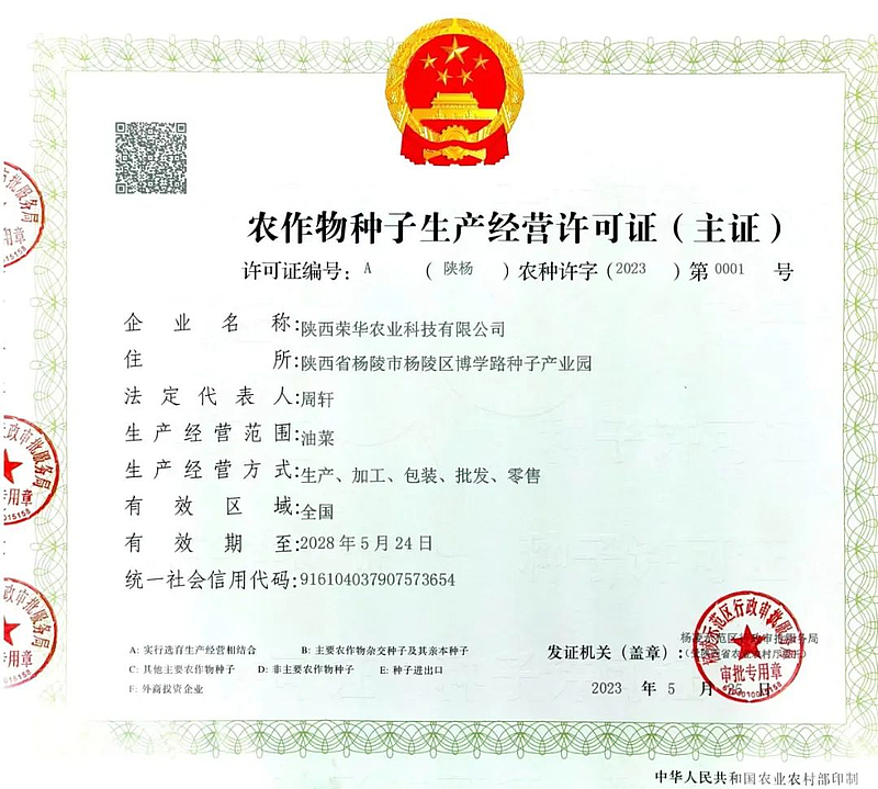 陕西荣华农业科技有限公司成立于2006年,是陕西省农业产业化重点龙头企业、陕西省高新技术企业。2021年,陕西荣华农业科技有限公司作为陕西唯一一家企业进入国家农作物种业企业阵型。2023年5月25日,以杂交油菜种子研发、生产、推广为依托,取得国家级育繁推一体化证书。