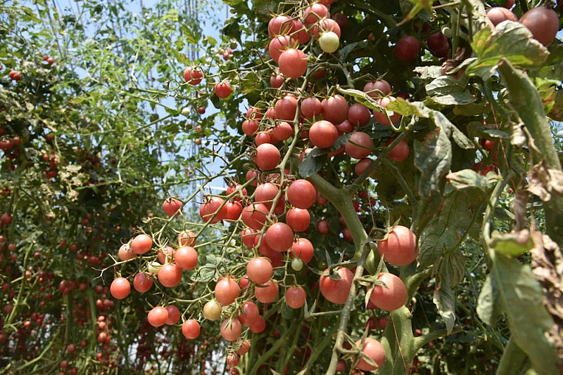 7月20日,在位于杨凌示范区的陕西金棚种业园区内,一座座现代化大棚整齐排列。制种番茄大棚里,一串串五颜六色的番茄点缀在绿叶间,生机勃勃。