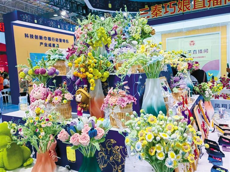 紧邻手工毛线花展台,“秦女子直播间”里传出主播宋远远的声音。她拿起手中的绣品,向手机屏幕另一边的“观众”进行推介。