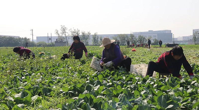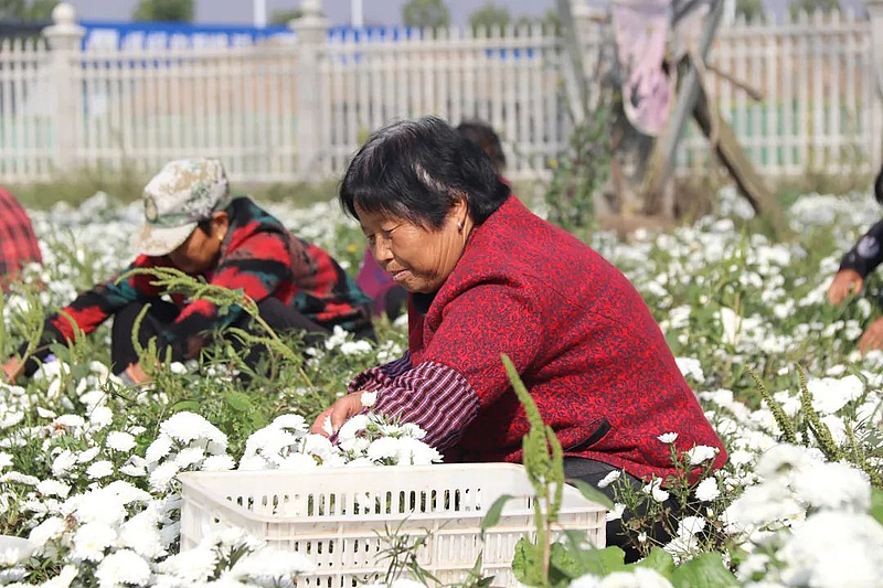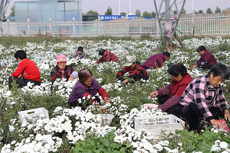 在与蔬菜基地一路之隔的菊花种植基地内,十几名采摘人员穿梭于花田之间,娴熟地采收着菊花,脸上挂着丰收的喜悦。