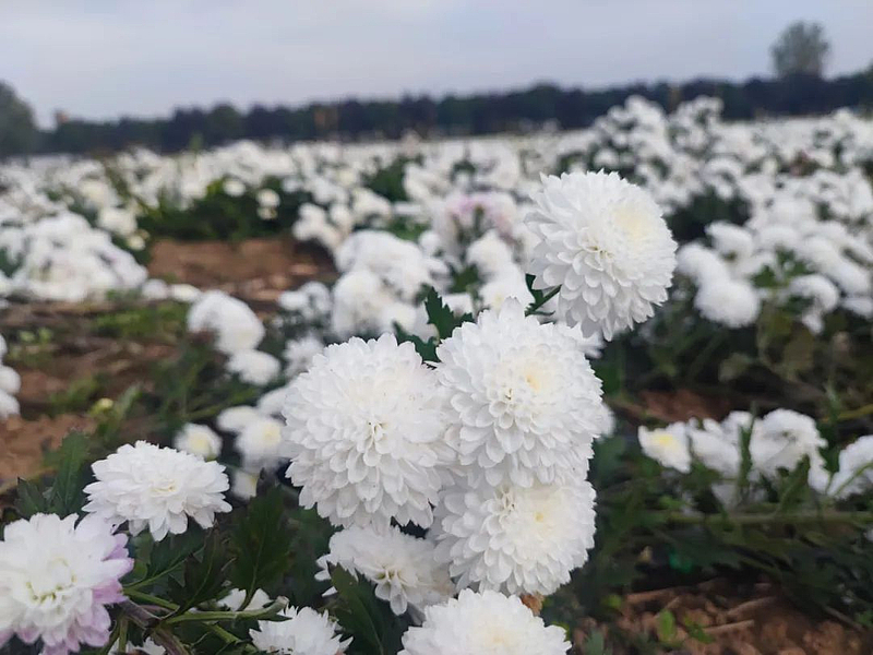 10月24日,走进崔家寨村菊花种植基地,放眼望去,成片的菊花摇曳生姿,一朵朵雪白的菊花竞相盛放,芳香扑鼻。趁着晴好天气,十几名村民分散在花田间忙着采摘,现场一幅丰收景象。