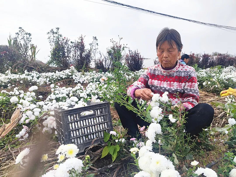 村民撒秀梅今年已经70多岁了,但采起菊花来,依旧手脚麻利,她说:“我现在早上送孙子去学校,中午吃完饭就来采菊花,一下午能收入五六十元,而且就在家门口,干活也很方便。”