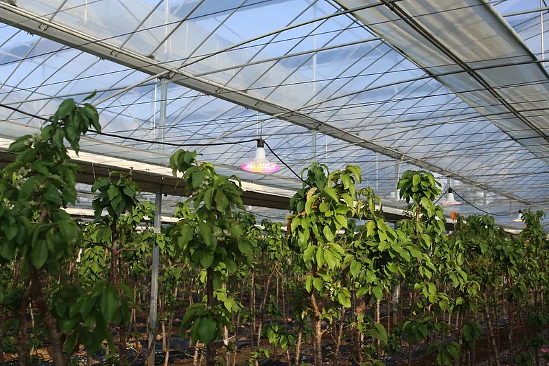 杨凌丰腾农业家庭农场负责人江正华说:“这个大棚占地面积是五亩地,它可以(实现)放风、温控、光控是一体化的。大树跟小树现在都是开花,从开花到结果,一直都是经过我们精心的管理,现在果实已经坐果,长势非常良好,在春节基本能上市。”