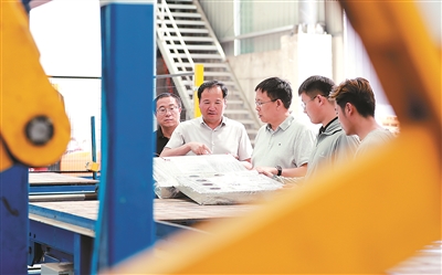 在东胜国有资产投资控股集团有限公司的建筑材料生产车间,李建明教授团队与该公司领导现场探讨新型相变复合保温墙体的产品定型及试生产技术等问题。