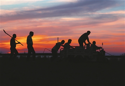 西北农林科技大学设施农业创新团队的师生们结束了一天的工作,行走在夕阳下。
