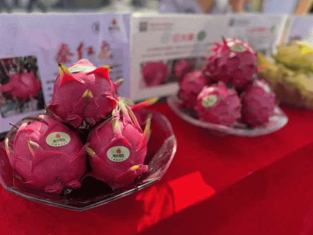 皮薄肉厚的火龙果、个大饱满的太秋甜柿、香甜软糯的红薯……绿色优质的农副产品以及各式非遗工艺品琳琅满目,描绘出乡村振兴的美好景象。