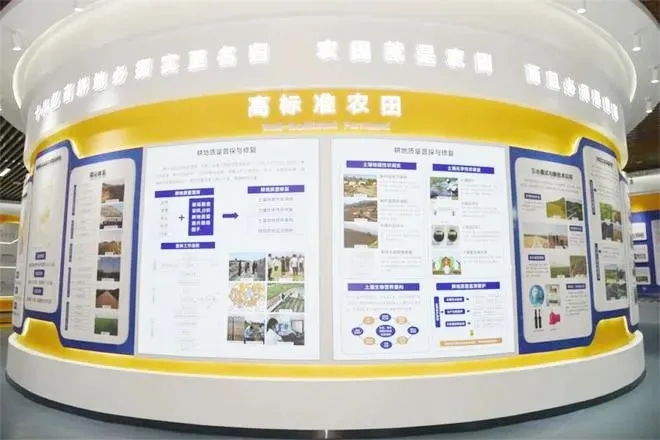 走进设置在杨凌耕地保护与质量提升创新中心的第31届杨凌农高会田间展——耕地质量提升展展点,记者看到,中心工作人员、中陕农建集团总工程师刘金宝正在对基地一楼展馆中的展示设备进行检查排查,逐一核对需要更新的展示内容、土壤样品。