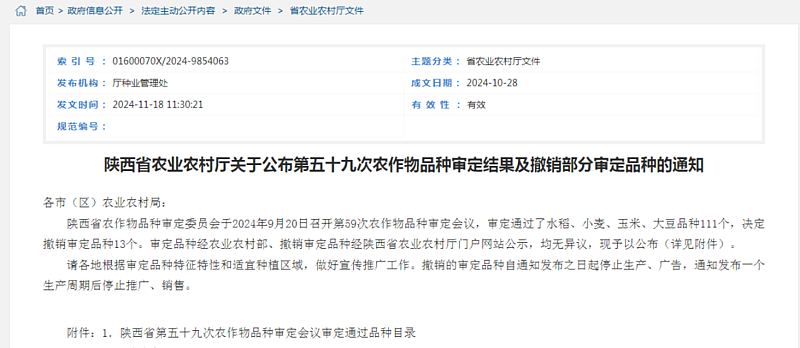 11月18日,陕西省农业农村厅公布了第五十九次农作物品种审定结果,审定通过了水稻、小麦、大豆、玉米等作物共111个新品种,其中杨凌选育品种43个,包括20个小麦新品种,占全省80%;3个大豆品种,占全省75%;20个玉米品种,占全省26%。