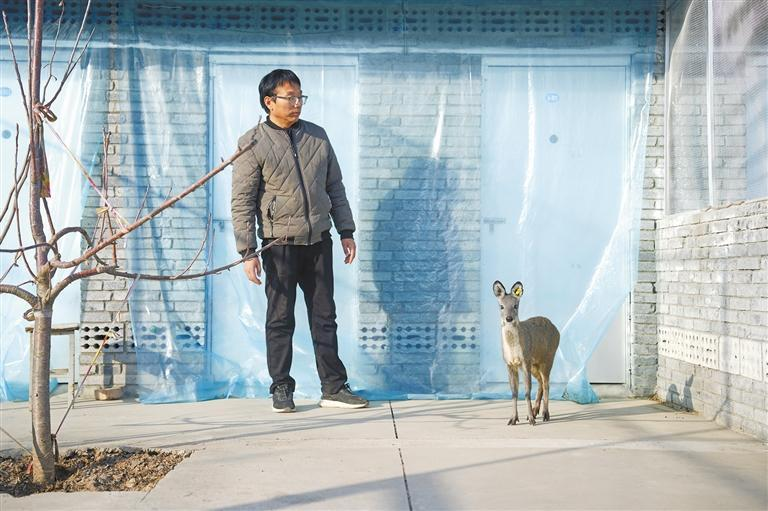 1月7日,杨凌林麝驯养繁育基地负责人赵东峰查看林麝生长情况。 本报记者 王晨曦摄