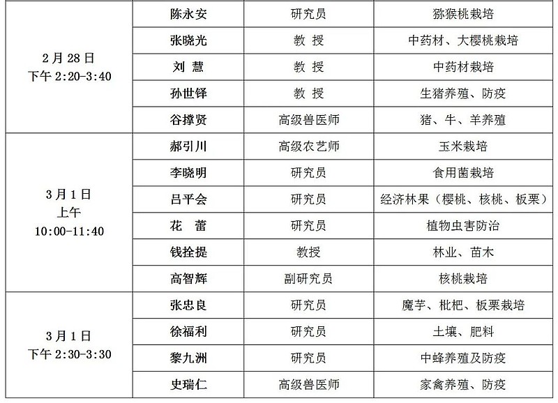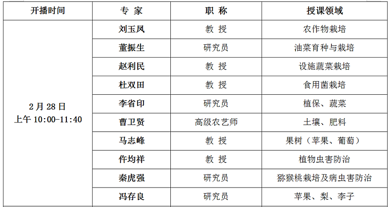 本次云课堂聚焦春耕生产关键环节,特邀理论知识丰富、实践经验充足的农科专家,为大家进行果树、蔬菜、中药材、畜牧、土肥、植保、花卉、病害防治、作物栽培等方面的培训,解决生产中遇到困难和问题。