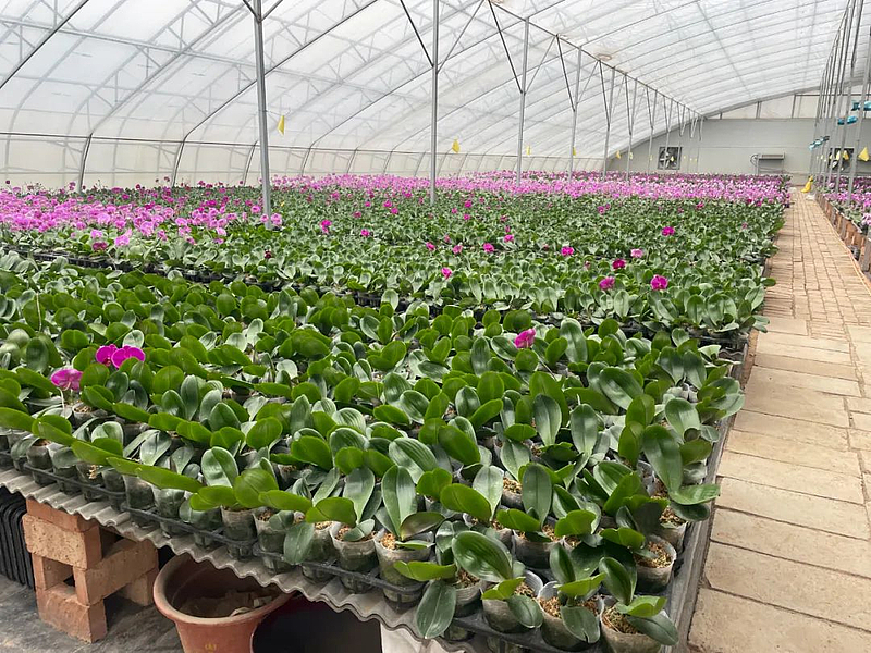 眼下,虽是初春时节,在杨陵区揉谷镇陵湾村杨凌沁歆园艺基地,占地18000㎡的智能温室里却是一片繁忙景象。周边在基地打工的村民们正忙着为2026年的年宵花季做准备,15个温控大棚内,30多个品种的蝴蝶兰苗正舒展着绿油油的“翅膀”。