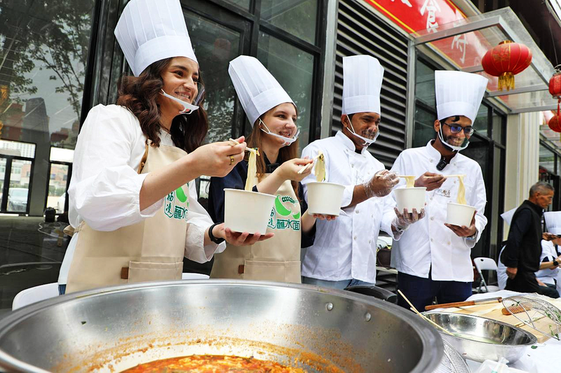 活动现场,来自杨凌各个餐厅的美食大厨云集响应,和面、揉面、扯面、调汁……从面粉到扯面,做面的大厨们施展着自己的拿手本领,成为现场一道靓丽的风景线。杨凌蘸水面以其独特的“裤带面”造型和浓郁鲜香的蘸汁而闻名。